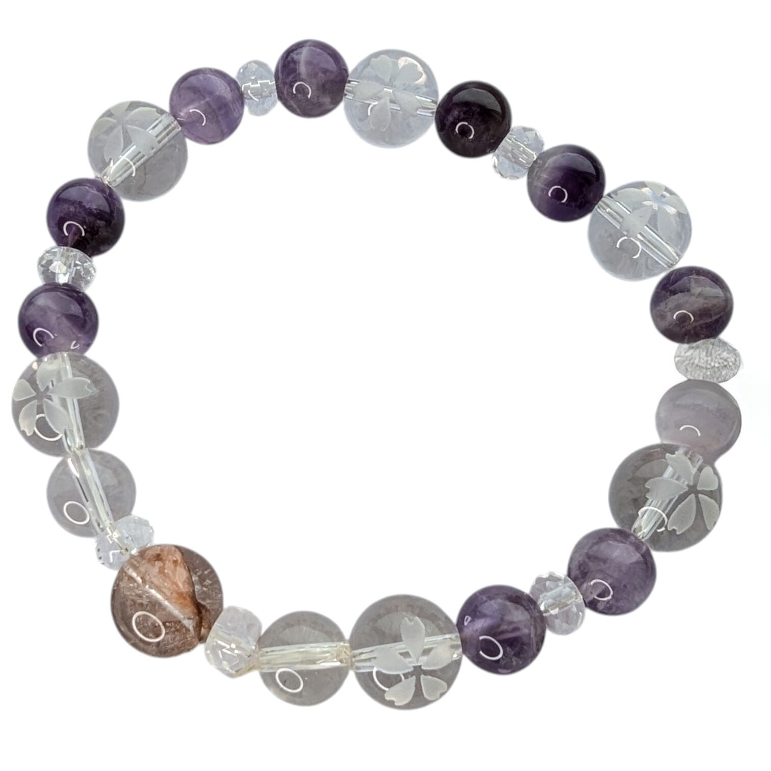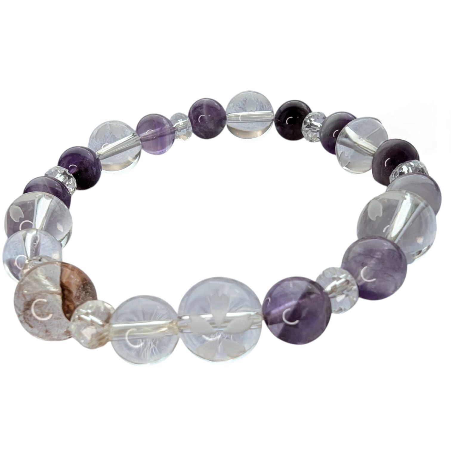 桜の模様が彫られた水晶とアメジストを組み合わせたオリジナルブレスレット、一点ものです。