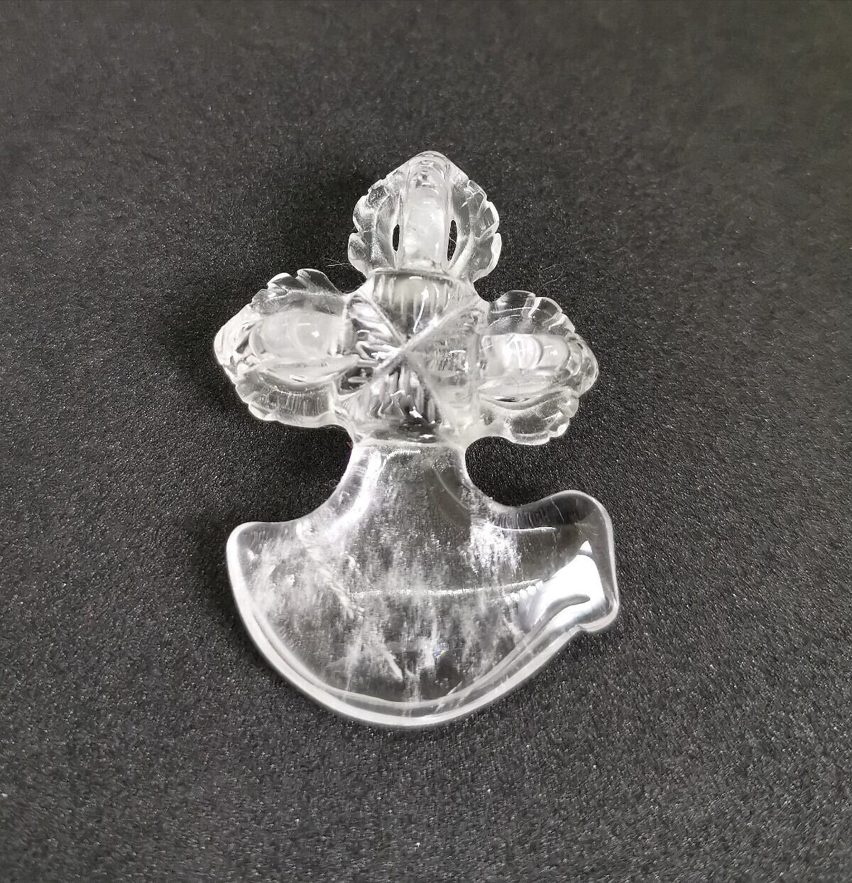 仏の方便を象徴し自己の煩悩を打ち砕く金剛杵が十字に組まれ、結界の法具、十字金剛杵にカルタリが組み合わさった十字金剛斧です。
