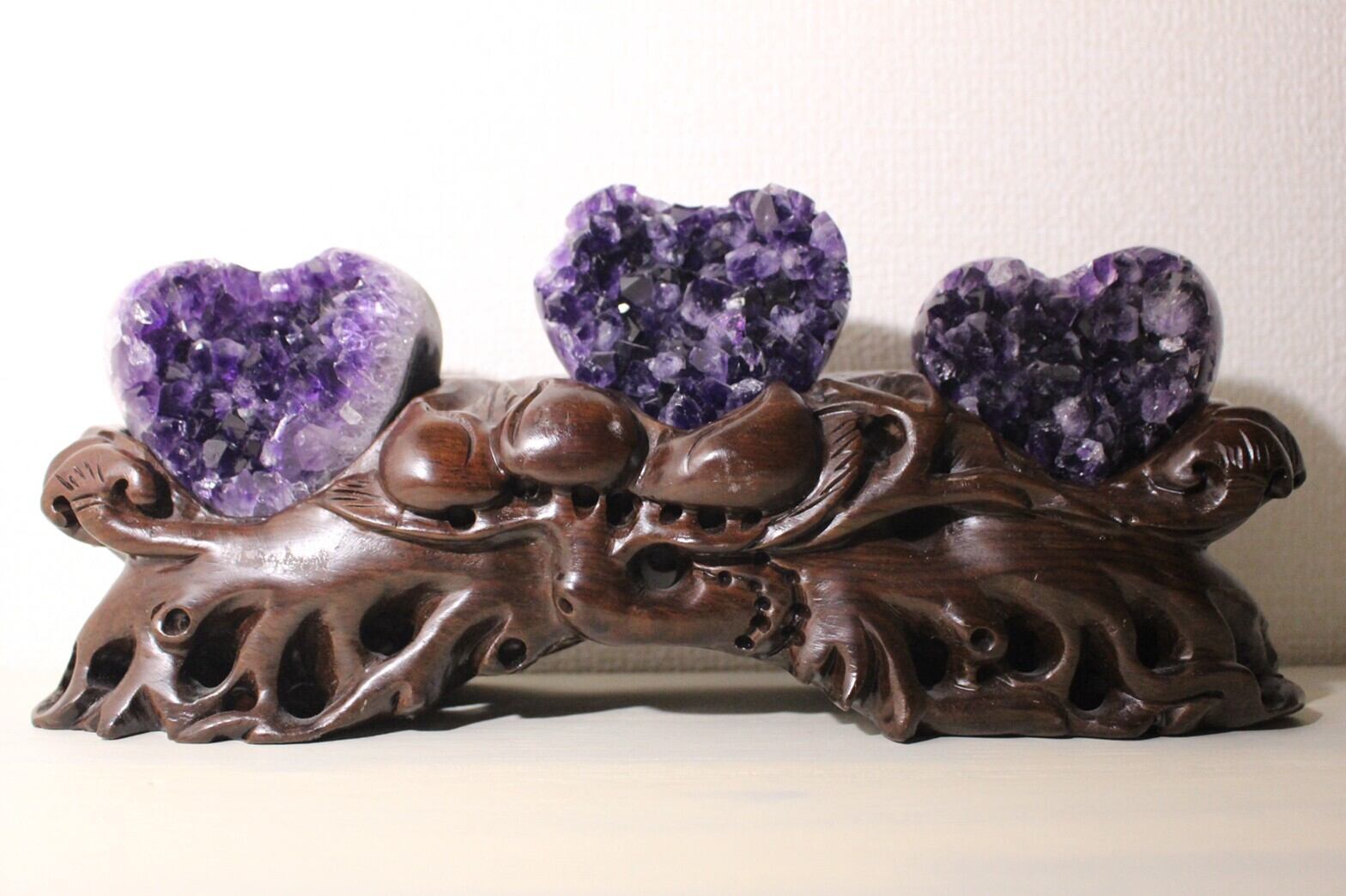 【愛の守護石・安眠】アメジスト ハート3セット 可愛く飾れます ※台座付