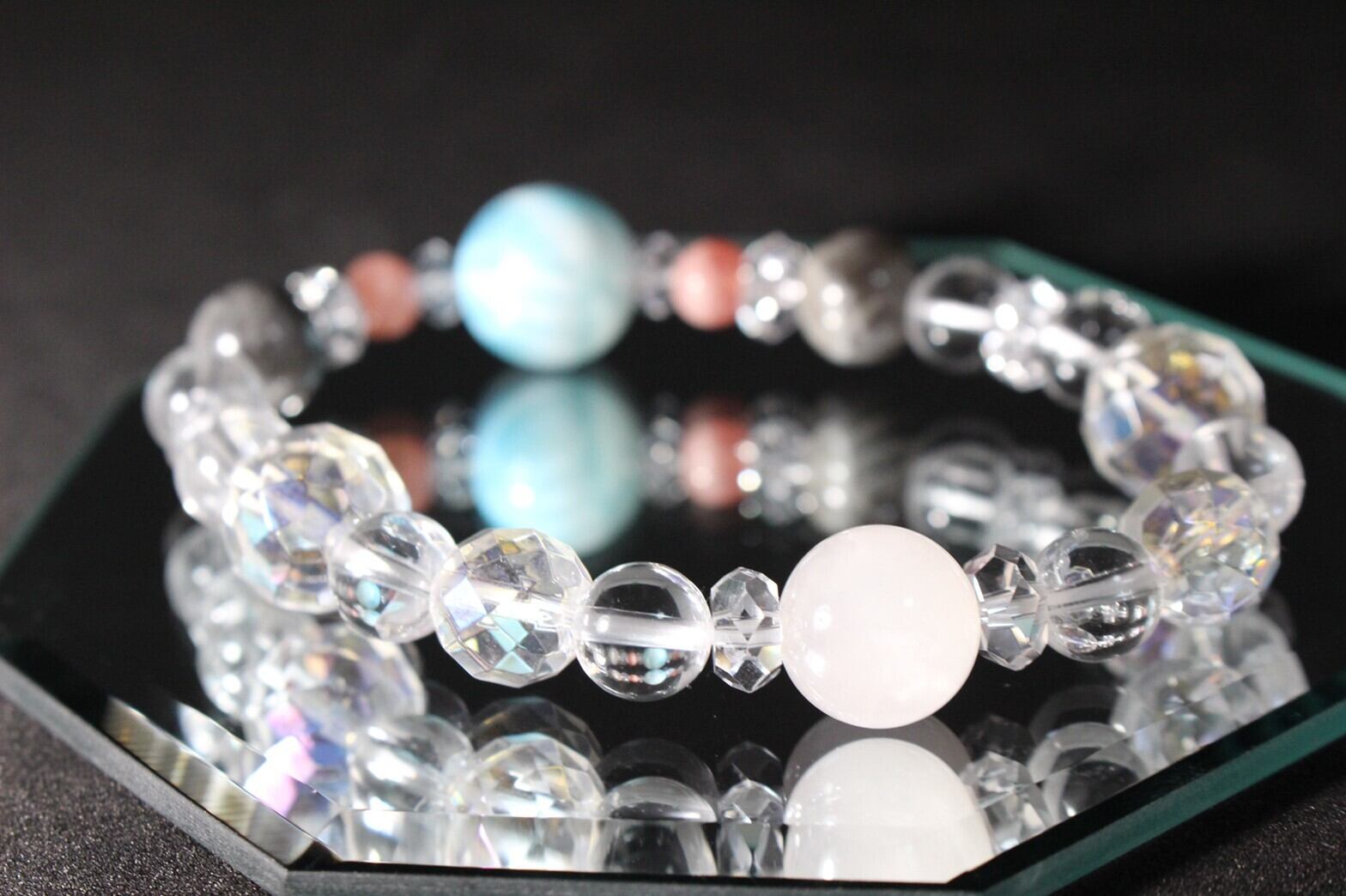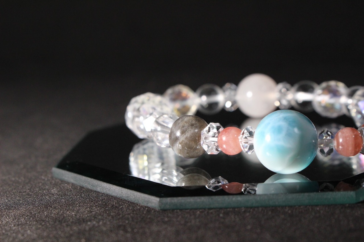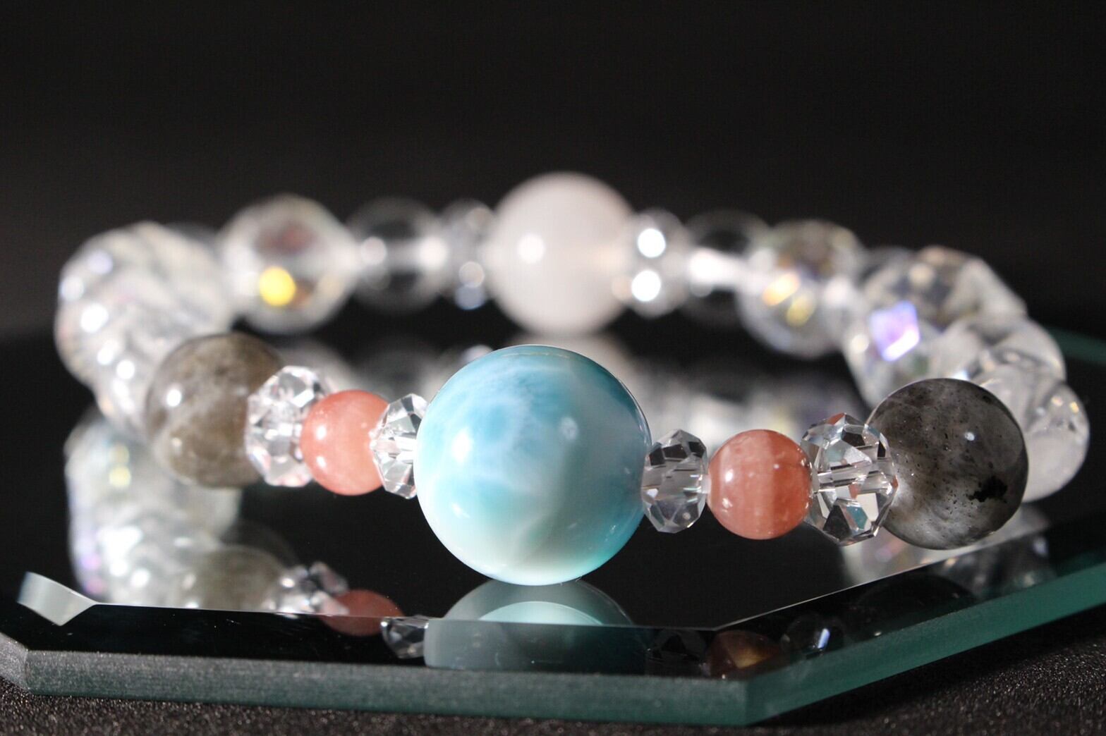 センターにラリマーをあしらい、インカローズやローズクォーツ、宇宙エネルギーを需要できるラブラドライトなどを使っています。
